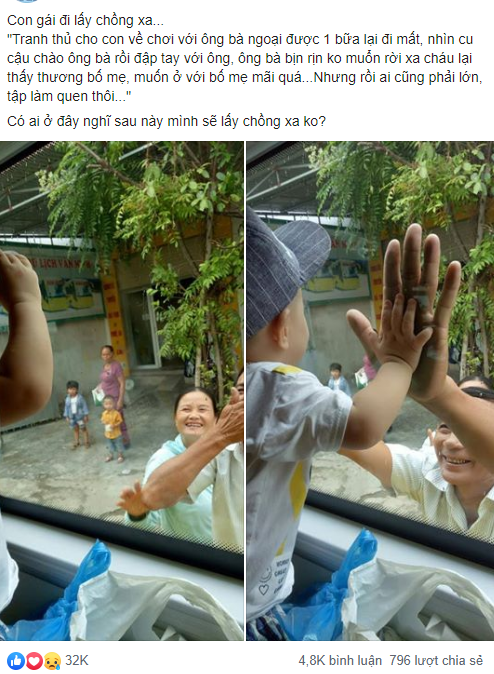 Mới đây, cảnh ông bà ngoại bịn rịn chia tay cháu qua cửa kính xe khách sau chuyến về thăm ông bà ngoại được nhiều diễn đàn chia sẻ. Khoảnh khắc này nhanh chóng gây xúc động, làm thắt lòng phận con gái lấy chồng xa.