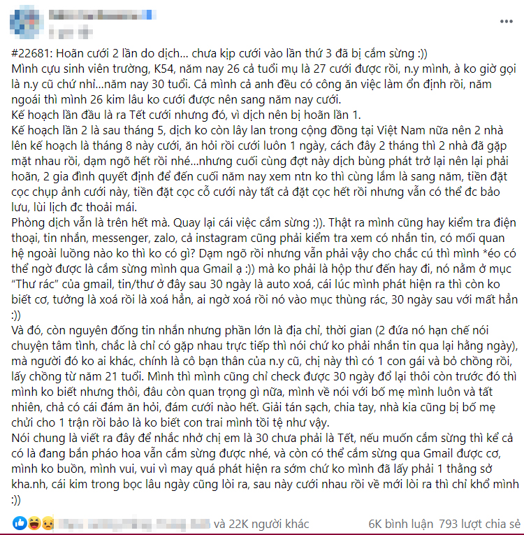 21/08/2020 13:47Hoãn cưới 2 lần do dịch, đến lần thứ 3 thì hủy luôn vì phát hiện chồng tương lai 'cắm sừng' qua gmail
