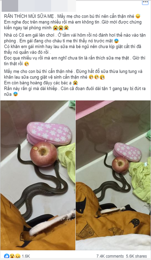 Mấy mẹ cho con bú thì cẩn thận nhé. Đừng hất đổ sữa thừa lung tung và khăn lau sữa cũng giặt vệ sinh cẩn thận nhé. Em còn bàng hoàng đây các bác ạ. Rắn này rắn gì mà dài khiếp. Còn cả đoạn đuôi dài tận 1 gang tay bị đứt ra nữa", dòng chia sẻ được đăng tải lên mạng xã hội khiến nhiều người hoang mang lo lắng.