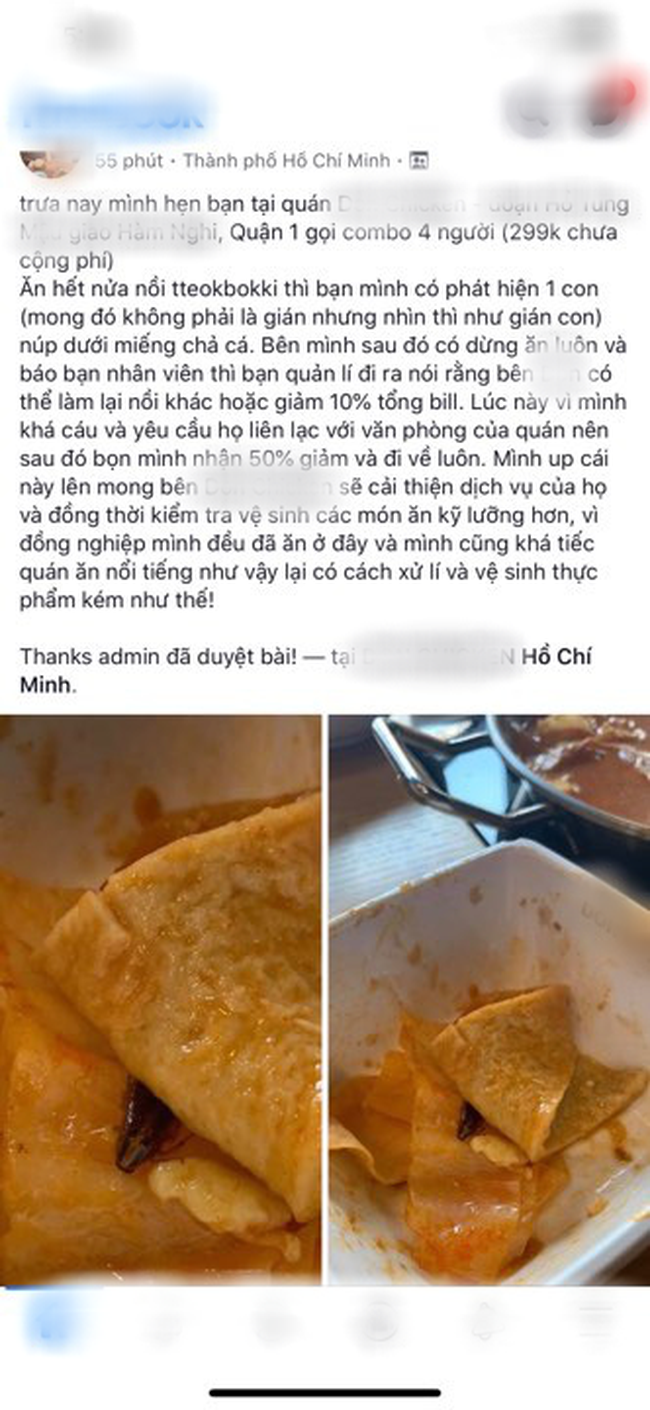 Mới đây, một nhà hàng ở TP.HCM lại tiếp tục bị "réo tên" vì có dị vật nghi là gián trong nồi Tteokokki. Tài khoản Facebook tên H.H đăng tải sự việc mình gặp phải khiến cộng đồng mạng hoang mang.