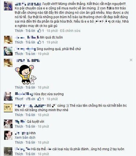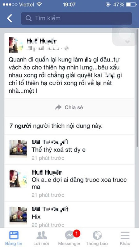 Phát hiện chồng cặp bồ, chị L.T chia sẻ trên một hội kín. “...Mình mới phát hiện ra thì có lẽ hơi muộn quá. Dù biết chồng mình “thối nát” nhưng mình điên máu quá các mẹ ạ. Hết tin nhắn mùi mẫn, đến ảnh không mặc gì trong điện thoại rồi thì clip chúng “...” với nhau,... Giờ là post hẳn ảnh lên facebook, bẩn thỉu từ cái tên, cái tiếng bẩn đi... Mình thực sự thấy khổ và bế tắc, mọi thứ như muốn nổ tung trong đầu chỉ vì 1 gã đàn ông quá khốn mang tiếng chồng”.