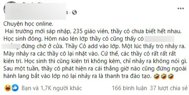 Chẳng hạn như câu chuyện được một giáo viên chia sẻ mới đây trên một hội nhóm nhận về gần 2 ngàn lượt yêu thích và bình luận. Theo cô giáo này, hai trường mới sáp nhập, 235 giáo viên, thầy cô chưa biết hết nhau, học sinh đông. Hôm nào lên lớp thầy cô cũng thấy có Đ.M.T đứng chờ ở cửa. Thầy cô add vào lớp, một lúc thấy trò nhảy ra. Nhảy ra các thầy cô lại nhặt vào. Cứ thế, các thầy cô rất rất rất kiên trì. Học sinh thì cũng kiên trì không kém, chỉ nhảy ra không nói gì.