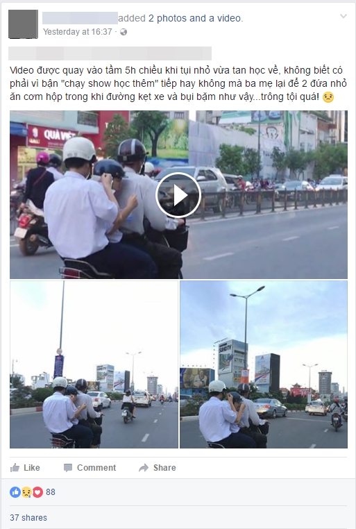 Sau khi chỉa sẻ, nhiều người bày tỏ lo lắng cho sức khỏe của các em khi phải ăn những bữa cơm tranh thủ, chớp nhoáng ngay trên xe máy như vậy.