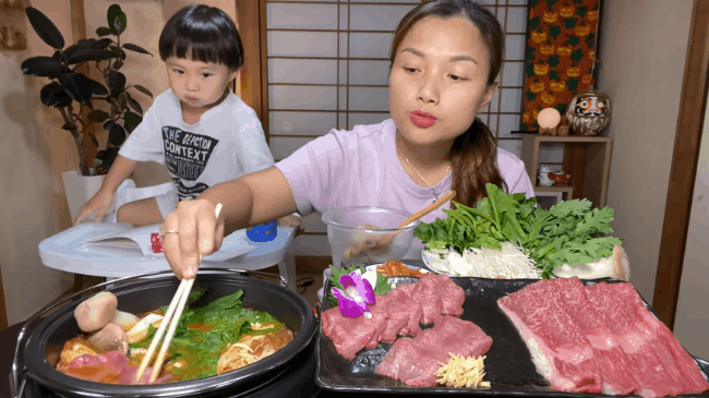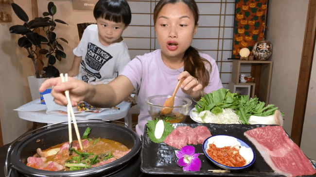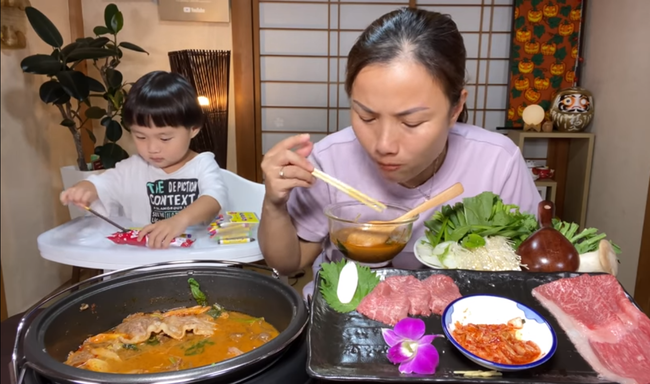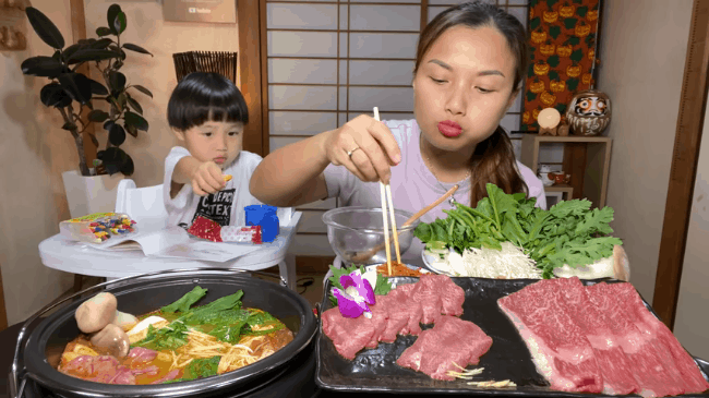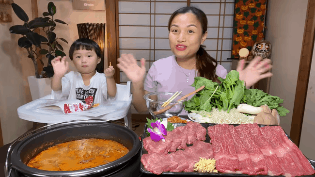 Như thường lệ, bà mẹ 34 tuổi bắt đầu bằng việc giới thiệu sơ qua về món ăn chị sẽ thưởng thức và review trong vlog. Món lẩu bò cay trong vlog mới nhất này bao gồm các nguyên liệu sơ chế sẵn như nước lẩu đóng gói, miến khô và nguyên liệu tươi sống như thịt bò Wagyu, lưỡi bò, rau cải, nấm.