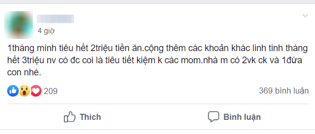 "Đấy là các mom kiếm được nhiều nên tiêu nhiều ý. Mình thì không kiếm ra tiền, có mỗi chồng mình tháng cao nhất cũng chỉ có hơn 8 triệu thôi. Chồng mình đi làm cách nhà có 2km nên không tốn nhiều xăng, sữa cho con 1 tháng 500k, bỉm 300k. Nhiều lúc cũng thấy kham khổ lắm nhưng nghĩ vì tương lai của các con, thôi lại cố.