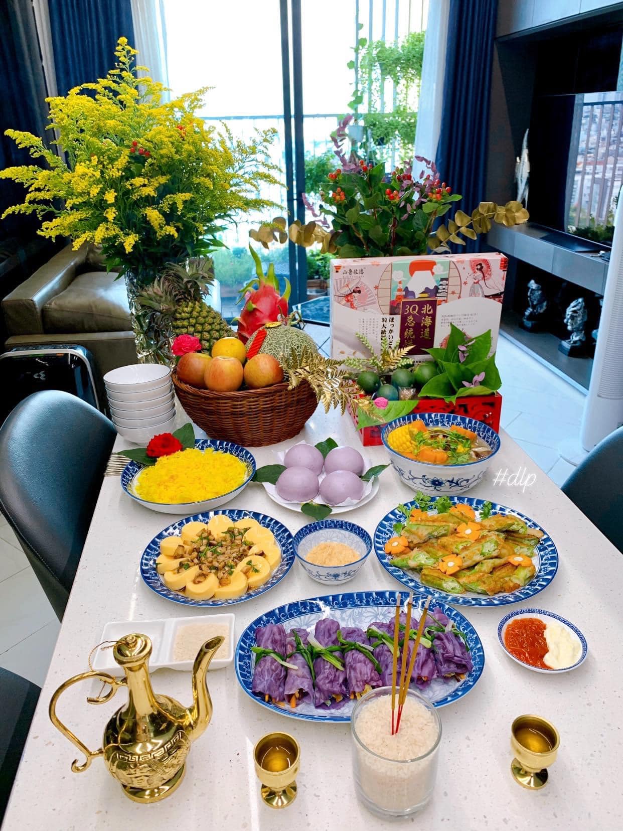 Còn đây là một mâm cúng chay vô cùng bắt mắt với cơm Saffron, bánh bao khoai môn, canh rau củ hầm, tàu hũ non sốt nấm đông cô, đậu bắp lăn giòn, bắp cải tím cuộn thập cẩm chay ăn với chao đậu.