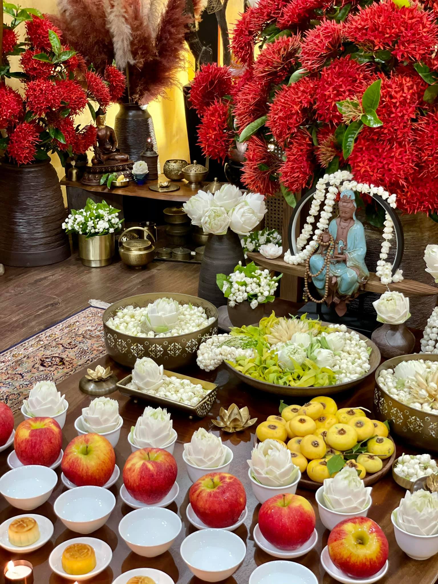 Bạn Doan Phuong Thao dâng hoa, đèn, nến... cúng Phật trong ngày Rằm tháng 7.