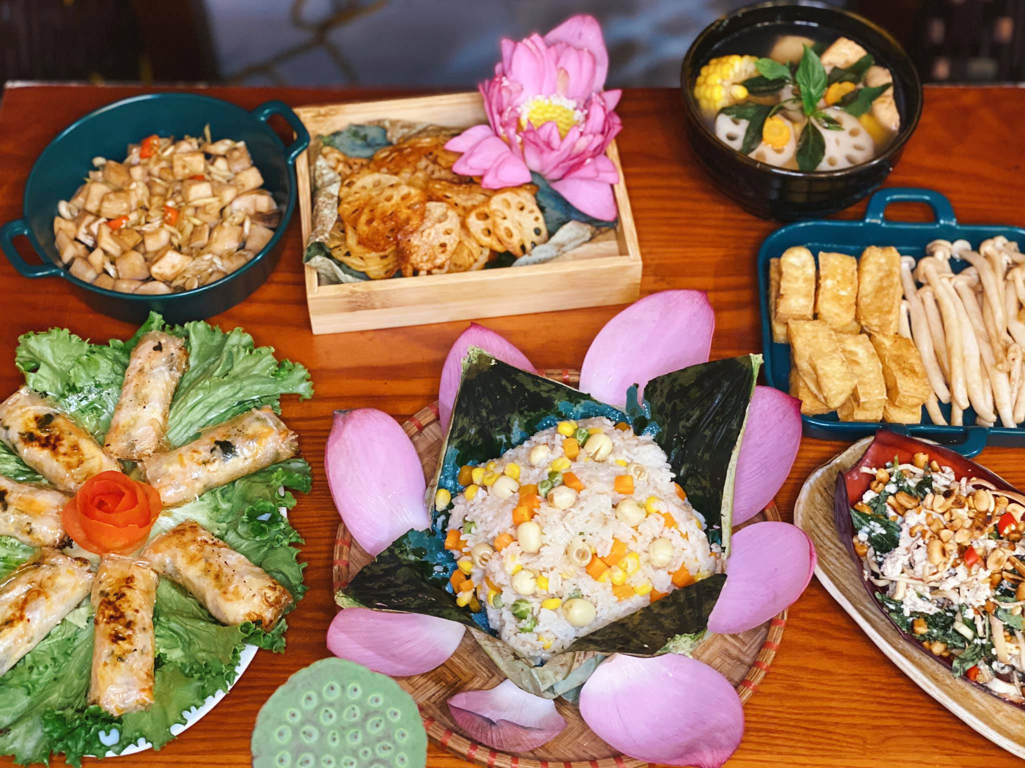 Mâm cơm chay này cũng vô cùng đẹp mắt với các món: canh củ quả nấm đùi gà, giò chay, nem chay, khoai lang kén chay, bánh bao chay, sườn non chay kho xì dầu đậu hũ, miến xào chay, củ quả luộc, xôi gấc, chè hạt sen long nhãn.