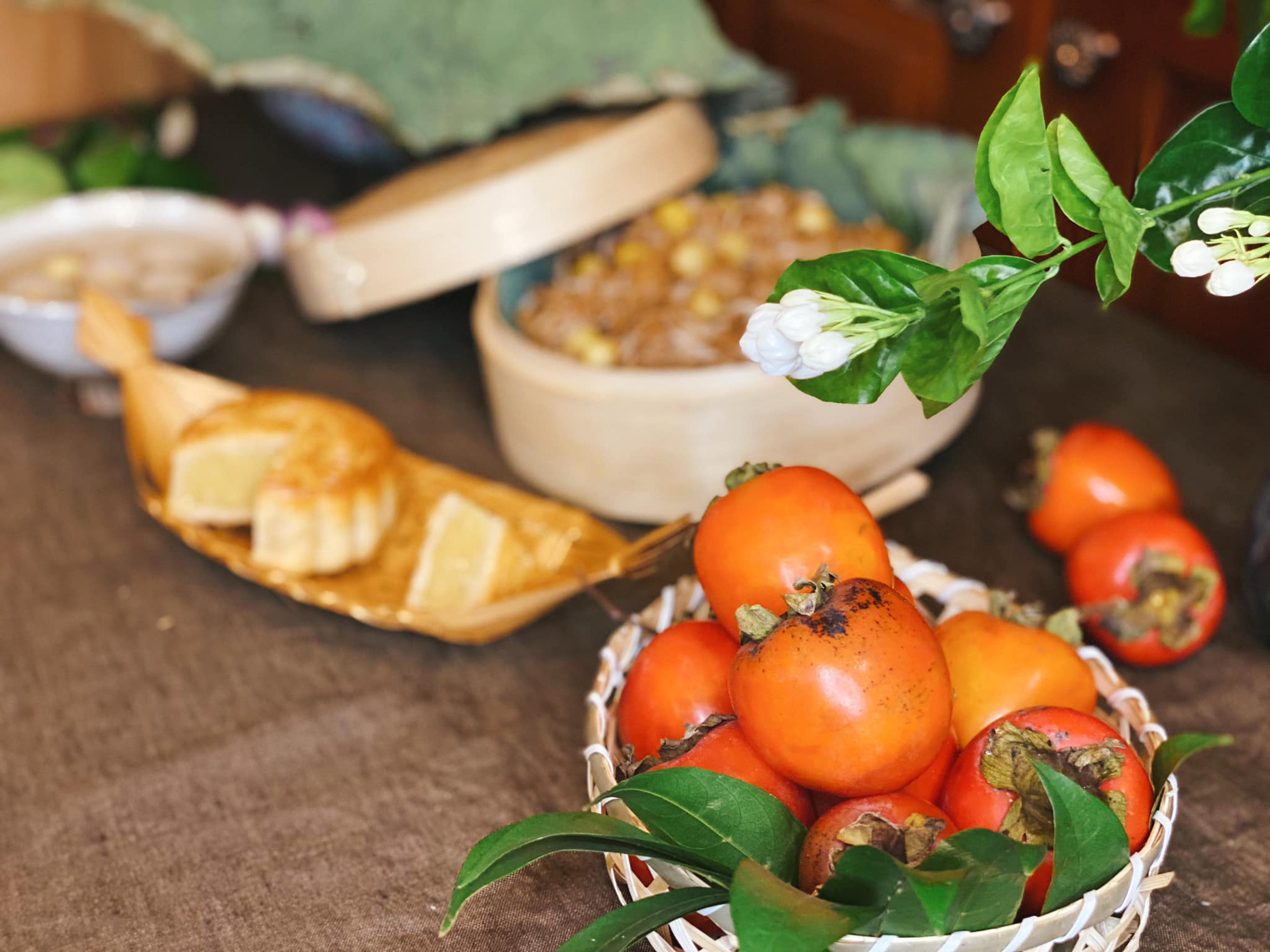 Một mâm cúng rằm của một cô gái ăn chay gồm có: xôi đỗ mix lạc, chè đỗ xanh, nem rán chay, đậu sốt thịt ba chỉ chay, canh khoai ngũ sắc.