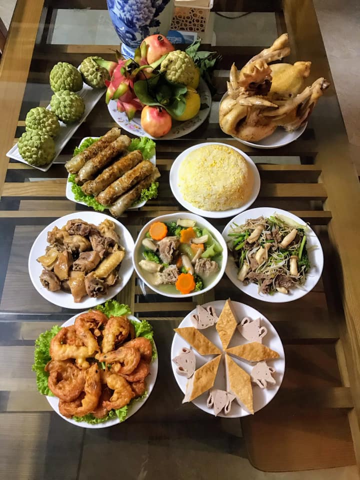 Mâm cúng với các món ăn Việt quen thuộc như gà luộc, giò chả, nem rán... đơn giản nhưng đầy đủ.