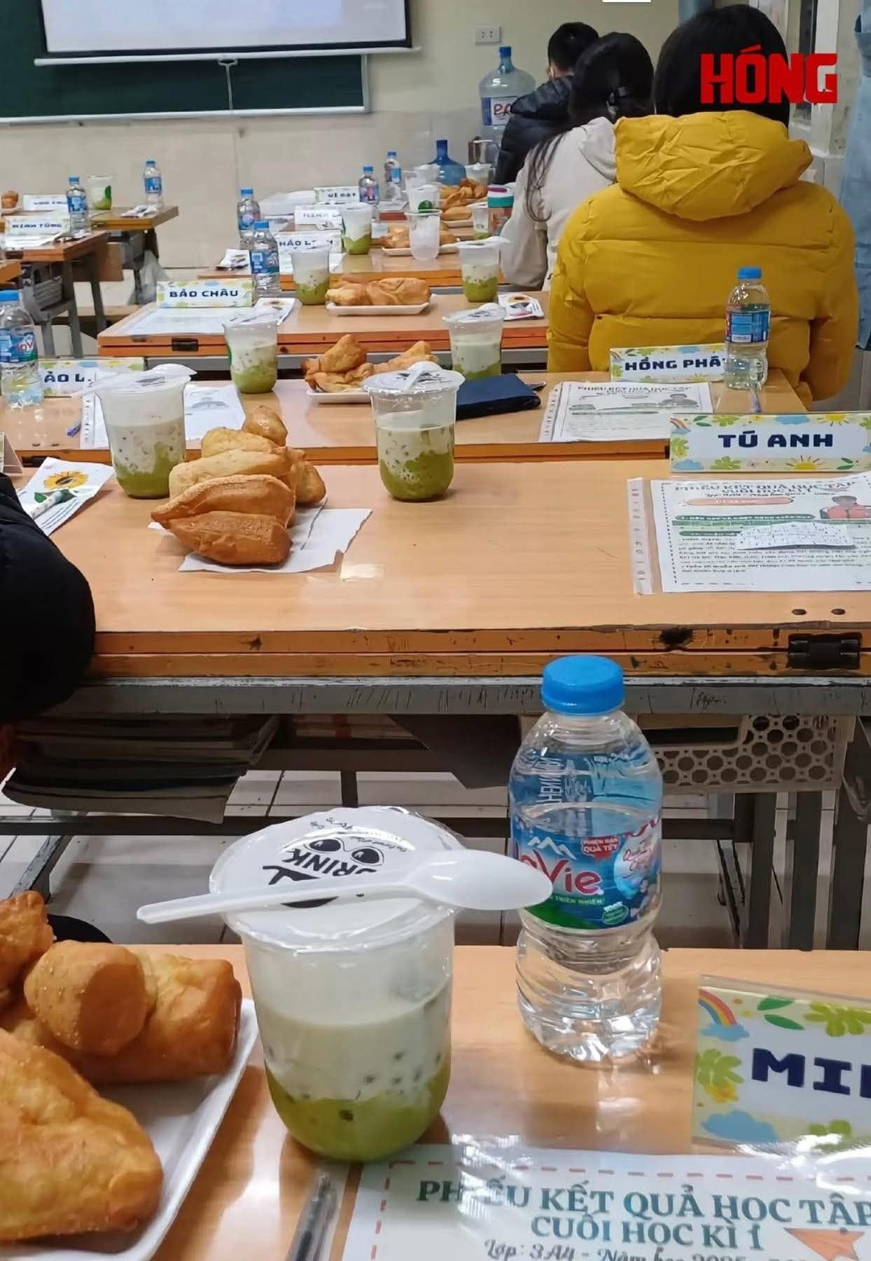 Không còn cảnh bàn ghế chỉ đặt hồ sơ, sổ sách hay bảng điểm quen thuộc, mỗi phụ huynh bước vào lớp đều được chuẩn bị sẵn bánh quẩy, chè mát và nước lọc. Theo chia sẻ, đây là sự sắp xếp có chủ ý của giáo viên chủ nhiệm nhằm tạo cảm giác dễ chịu, thoải mái cho buổi gặp gỡ.