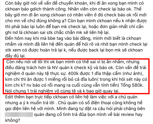 Dù vậy ở đoạn sau bài đính chính, cô lại... đổ thừa cho nhân viên là đáng trách khi đã không check kỹ và báo lại cho nhóm của cô? Sau đó, người này tiếp tục chê về bữa ăn hôm đó