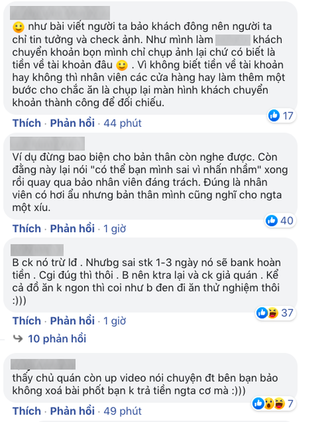 Dưới phần bình luận, có 1 nhân viên quán khác cũng xác nhận trường hợp tương tự với nhóm bạn kia, cụ thể: "Mọi người ơi, bạn này cũng dùng thủ đoạn này tại nhà hàng em làm ạ. Đúng thủ đoạn chuyển khoản chậm xong viết thiếu 1 số rồi tự điền tên đây ạ. Do khách đông và thu ngân chỉ kiểm tra đúng tên số tài khoản nên không để ý số tài khoản ạ. Bạn em liên hệ với bạn ấy và hơn 1 tháng mới đòi lại được tiền. Do bên em biết chỗ ở của bạn ấy nên mới được chuyển trả. Chứ công cuộc đòi tiền của bạn này gian nan lắm ạ."