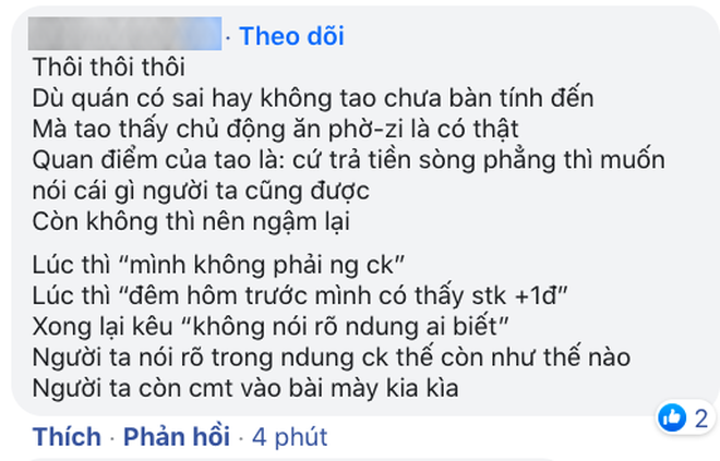- "Ngân hàng bạn dùng được miễn phí chuyển khoản thì chẳng có lý do gì chuyển nhanh sang chuyển thường cả bạn ơi? Và nếu bạn chuyển sai thì ngân hàng sẽ hoàn tiền về tài khoản của bạn ngay, sao lúc đó không liên hệ lại phía quán mà đợi bị phốt mới lên kể lể?"