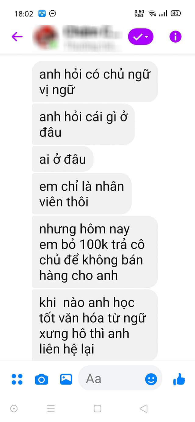 Thế nhưng, sau khi đọc những dòng tin nhắn trỏng lỏn, trống không của khách hàng thì phía shop đã thẳng thừng từ chối bán muối chấm. Nhân viên trực fanpage còn mạnh dạn "giáo dục" anh chàng một bài rồi thẳng tay block luôn: "Anh ơi. Anh hỏi có chủ ngữ vị ngữ. Anh hỏi cái gì ở đâu? Ai ở đâu? Em chỉ là nhân viên thôi, nhưng hôm nay em bỏ 100k trả cô chủ để không bán hàng cho anh."