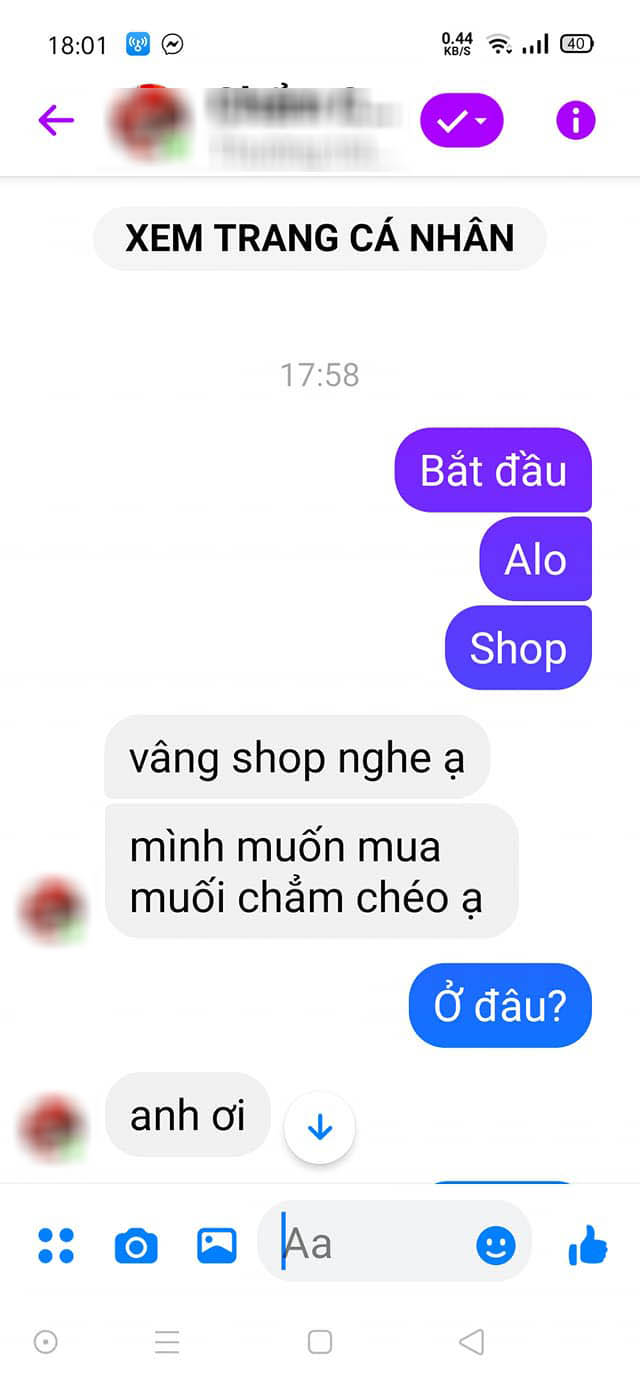 Kèm theo đó là hình ảnh chụp lại đoạn chat giữa S.N và shop bán muối chấm chẩm chéo. Anh chàng gửi 3 lần, với nội dung rời rạc là: "Bắt đầu", "Shop", "Ở đâu". Ngược lại, nhân viên trực fanpage của shop trả lời khá đầy đủ chủ vị và lịch sự: "Vâng shop nghe ạ", "Mình muốn mua muối chẩm chéo ạ?".
