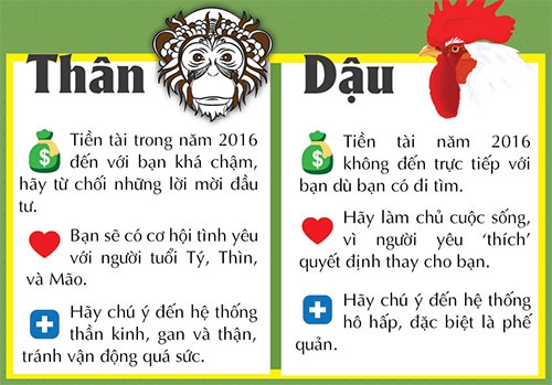 Theo quan niệm dân gian, năm Bính Thân 2016, may mắn về tiền tài sẽ đến với người tuổi Dần, Mão, tình yêu sẽ tìm đến những người tuổi Ngọ, Thân.