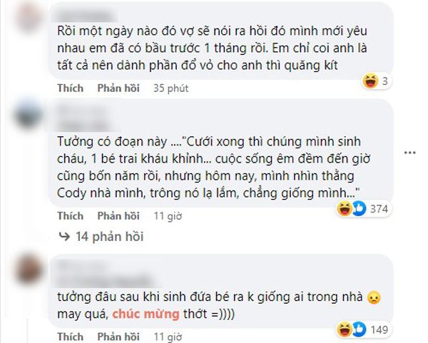 - Cái hôm mà chúng mình ình ịch ấy, có thằng Cody nhà mình ấy. Thật ra á, em căn ngày dễ dính bầu nhất đấy. Xong á, em cũng giả vờ say đấy chứ anh tuổi con tôm mà đòi em say hơn.