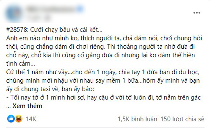 Với nhiều người, chuyện chỉ vì mang thai mà kết hôn thật sự là "tai nạn". Ai chẳng muốn tình yêu chín muồi thì đi đến chuyện kết hôn. Tuy vậy, thực tế vẫn có hàng loạt các "tai nạn" xảy ra và đám cưới cũng vì thế mà tới. Mới đây, một người chồng kể câu chuyện kết hôn của mình. Dân mạng đọc xong mà phải bật cười vì hài hước hết sức.