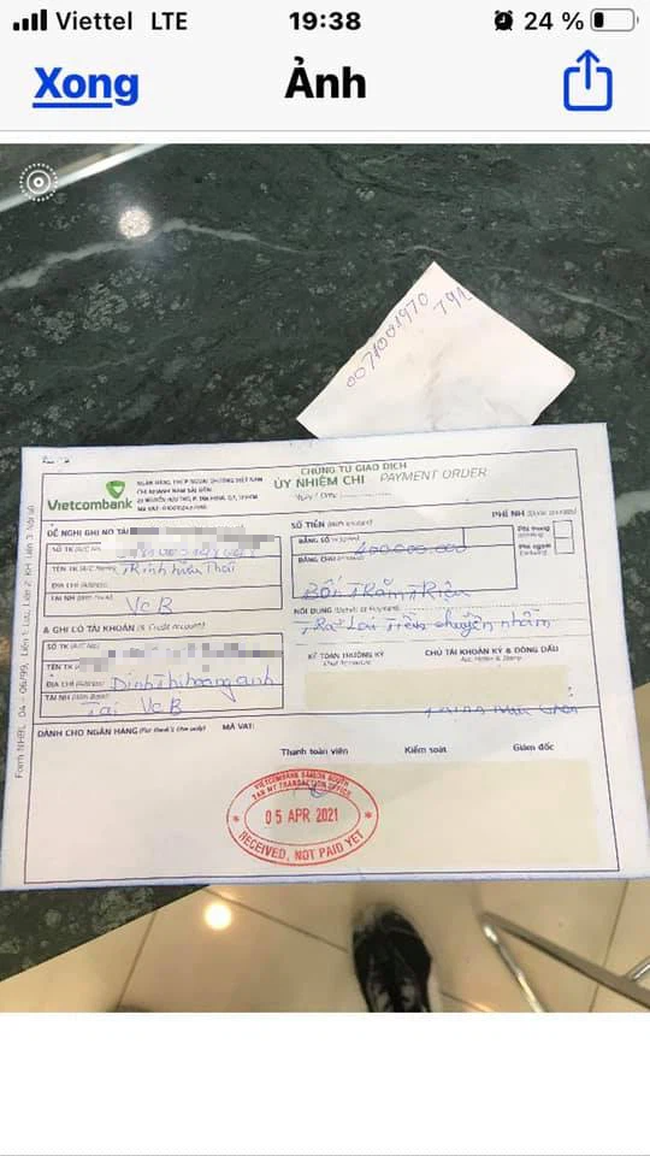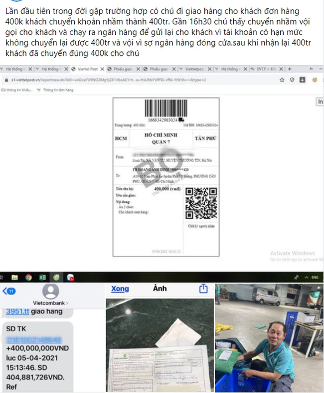 "Lần đầu tiên trong đời gặp trường hợp có chú đi giao hàng cho khách, đơn hàng 400k, khách chuyển nhầm thành 400 triệu. 16h30 chú mới biết thì vội vàng ra ngân hàng để gửi lại khách vì tài khoản có hạn mức không chuyển lại được số tiền lớn như vậy và vội vì sợ ngân hàng đóng cửa. Sau khi nhận lại 400 triệu khách đã chuyển đúng 400 nghìn cho chú".