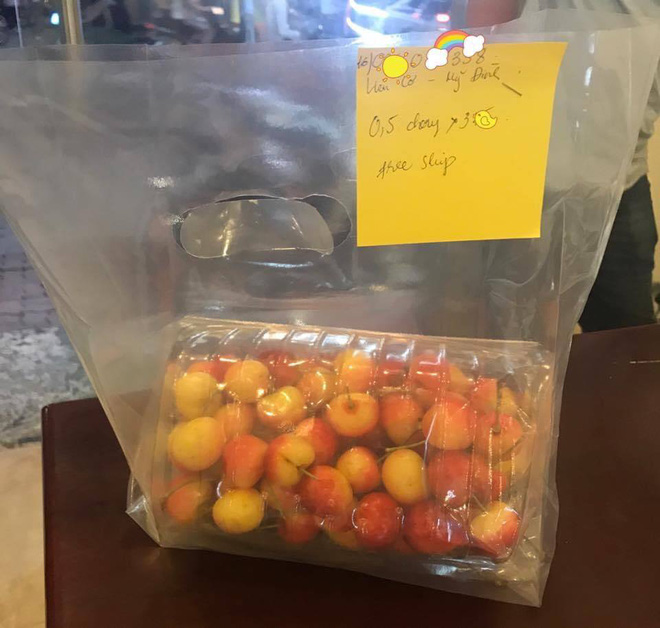 Gửi cho bạn ấy túi cherry hơn một cân, nhưng vẫn dặn nhân viên lấy tiền đúng nửa cân.