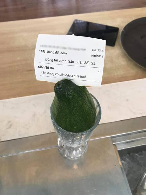 Tình huống được kể là một vị khách nọ vào quán đồ uống order sinh tố bơ với khá nhiều điều kiện, nào là không bỏ đường, không sữa đặc, không sữa tươi, nôm na là tránh ăn ngọt. Không hiểu cách thể hiện thế nào mà cuối cùng người nhân viên lại bê ra món nước như thế này: