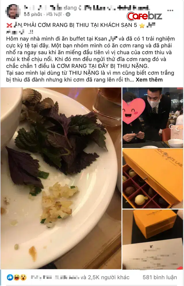31/01/2021 14:39Khách sạn 5 sao Hà Nội bị tố bày cơm rang thiu lên buffet, xin lỗi khách hàng nhưng tặng hộp sô-cô-la thiếu mất... 1 viên