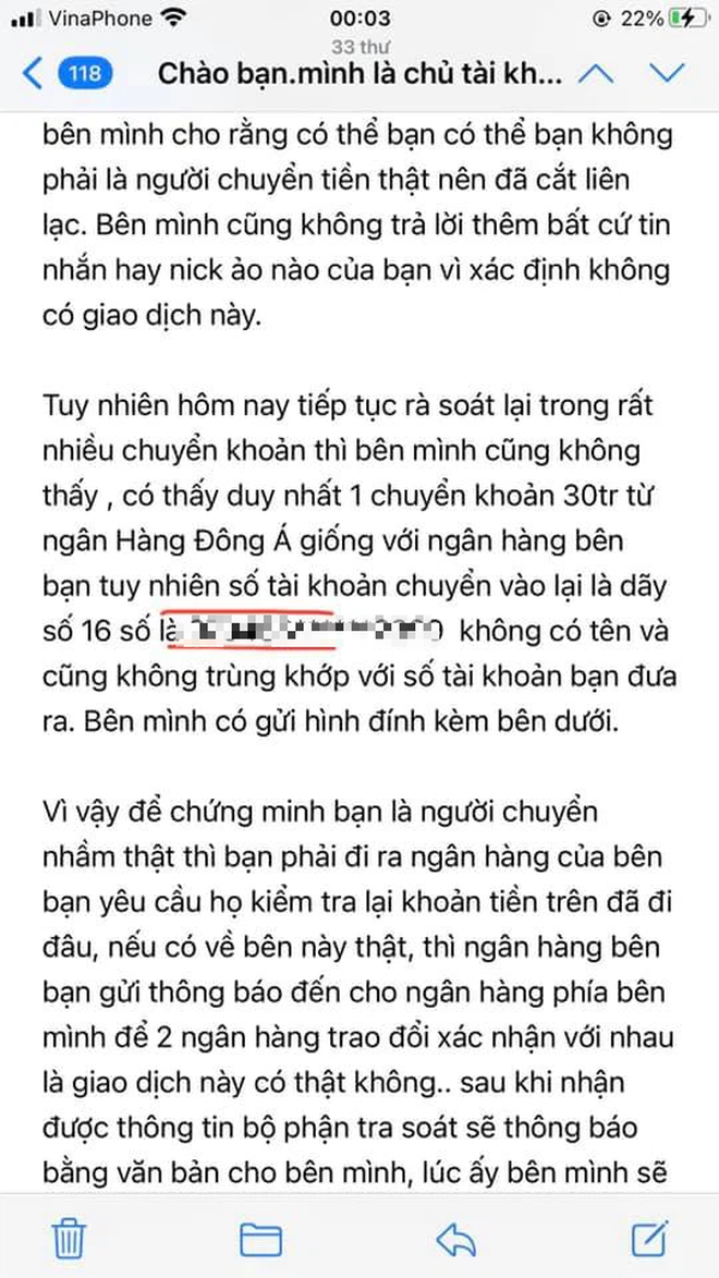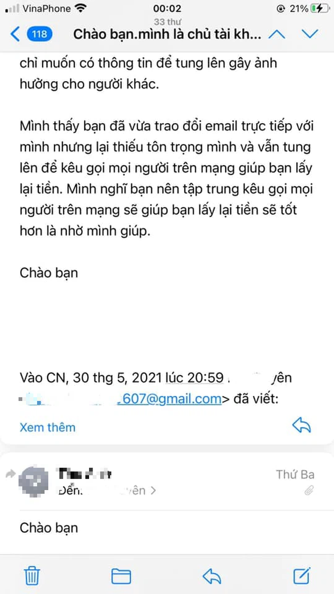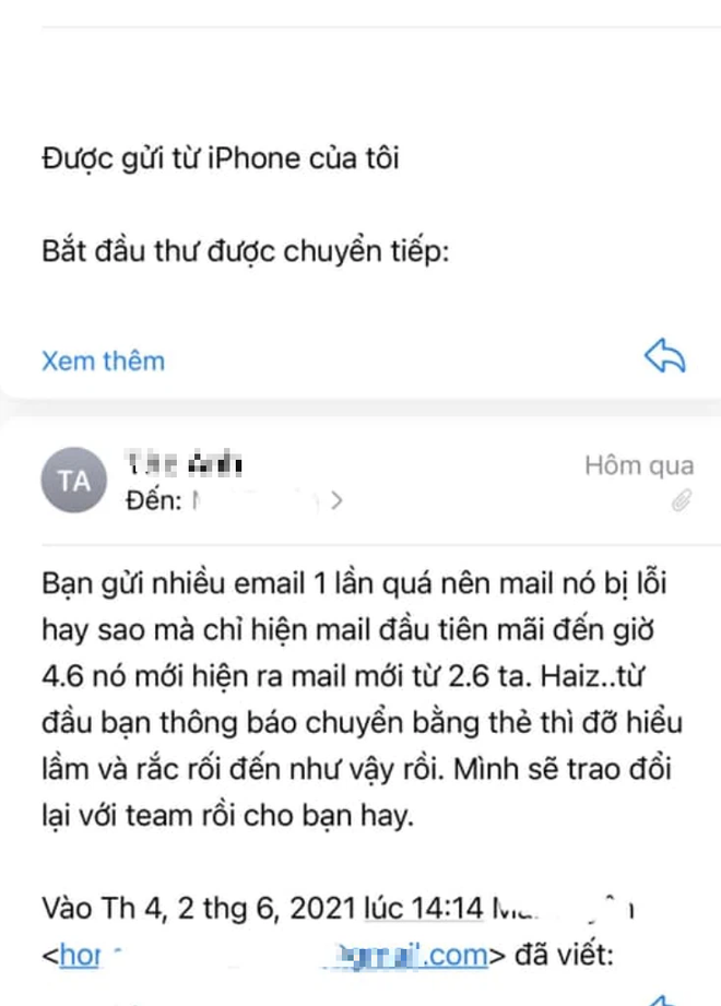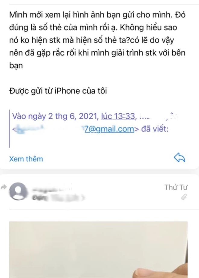 4. Chị quản lý trong suốt lúc trao đổi 6 tháng CHƯA TỪNG HỎI về sự khác biệt số tài khoản và số thẻ. Tối qua mình không xem bài chị Thuỷ Tiên, nhưng lúc chị Tiên hỏi trong email trao đổi ngày 1 và 2/6 mới đề cập. Mình nghĩ đơn giản nó là 2 số khác nhau nhưng chủ tài khoản chỉ có 1, là mình. Mình chủ động đề nghị chị cùng mình đến ngân hàng xác minh nhưng không có email đáp. Tối hôm qua nghe bảo chị Thuỷ Tiên trách mình sao 2 số khác nhau. Nếu chị hỏi thì mình giải thích rồi, vì mình đợi email nên không biết chị đăng Facebook. Email mình sẽ đăng ở dưới.