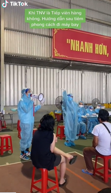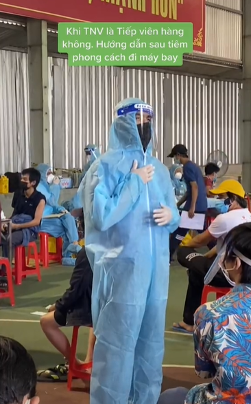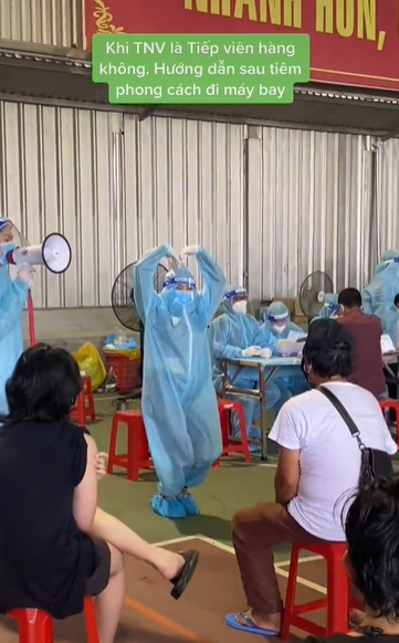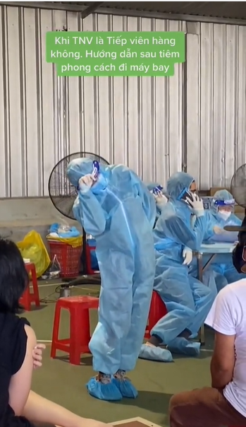 Cụ thể, trong video là nhóm tình nguyện viên đang hướng dẫn người dân sau khi tiêm vaccine. Trong đó, một người đọc các hướng dẫn, hai người miêu tả bằng những hành động như các tiếp viên hàng không thường làm.