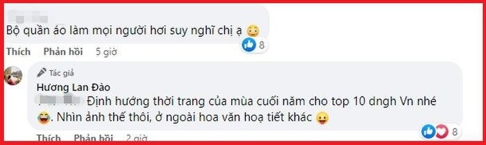 Đây cũng là bình luận được bà Đào Lan Hương đáp lại trong bài đăng này. "Định hướng thời trang của mùa cuối năm cho Top 10 D.N.V.N nhé. Nhìn ảnh thế thôi, ở ngoài hoa văn hoạ tiết khác", nữ doanh nhân viết.