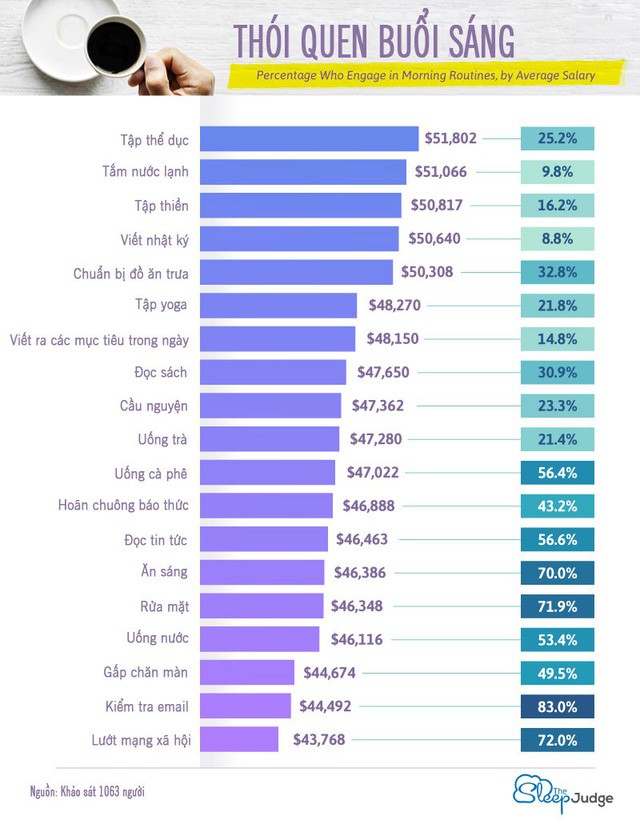 Theo cuộc khảo sát khoa học mới nhất trên trang The Sleep Judge với sự tham gia của hơn 1.000 độc giả, những người luôn thực hiện thói quen dậy sớm một cách nghiêm ngặt kiếm được nhiều hơn những người bình thường khoảng 12.500 USD/năm.
