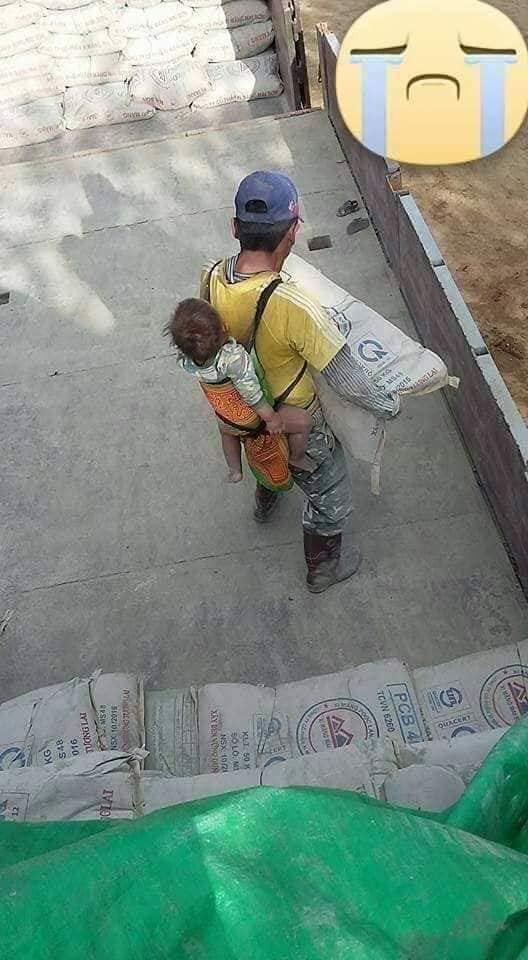 Theo đó, vợ bỏ đi để lại đứa con thơ nên người đàn ông này đã phải mang theo con đến công trường để làm việc. Để có tiền mua sữa cho con, người đàn ông này đã phải vác 10 tấn xi măng nặng nhọc mỗi ngày.