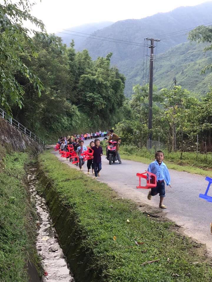 Thay vì được mặc quần áo đẹp, trắng sáng tinh tươm, với balo, cặp sách và bố mẹ ông bà dắt tay đến trường, những cô cậu học sinh nhỏ tuổi ở bản Nậm Cang, Sa Pa, Lào Cai lại đi chân đất nối đuôi nhau chạy đi dự lễ khai giảng. Đặc biệt hơn, đứa trẻ nào cũng cầm trên tay 1 chiếc ghế nhựa, khiến hàng nghìn thành viên mạng chú ý.