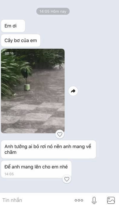 "Em ơi cây bơ của em, anh tưởng ai bỏ rơi nó nên anh mang về chăm. Để anh mang lên cho em nhé".
