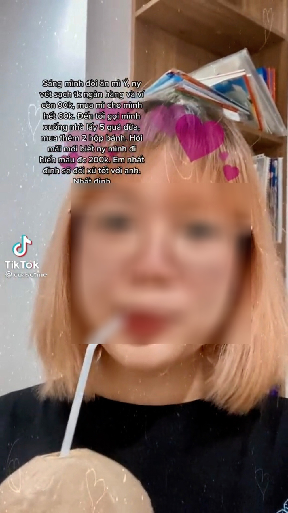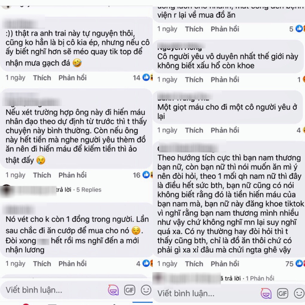 - Việc hiến máu và nhận được tiền hỗ trợ là ngẫu nhiên trùng hợp với thời điểm mà cô bạn gái bày tỏ mong muốn thèm ăn, chứ không có chuyện chàng trai này đi bán máu lấy tiền nuôi bạn gái, nên nhiều bạn đừng toxic như vậy.