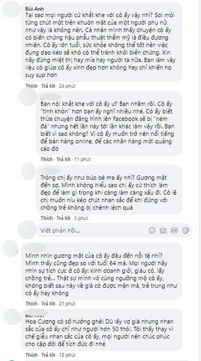 - Mình nhìn gương mặt của cô ấy đâu đến nỗi tệ nhỉ? Mình thấy cũng đẹp so với tuổi 64 mà. Mọi người hãy nhìn sự tích cực ở cô ấy: kinh doanh giỏi, giàu có, lấy chồng trẻ… Thật sự mình vô cùng ngưỡng mộ cô ấy, không biết sau này về già có được mặn mà, trẻ trung như cô ấy hay không.
