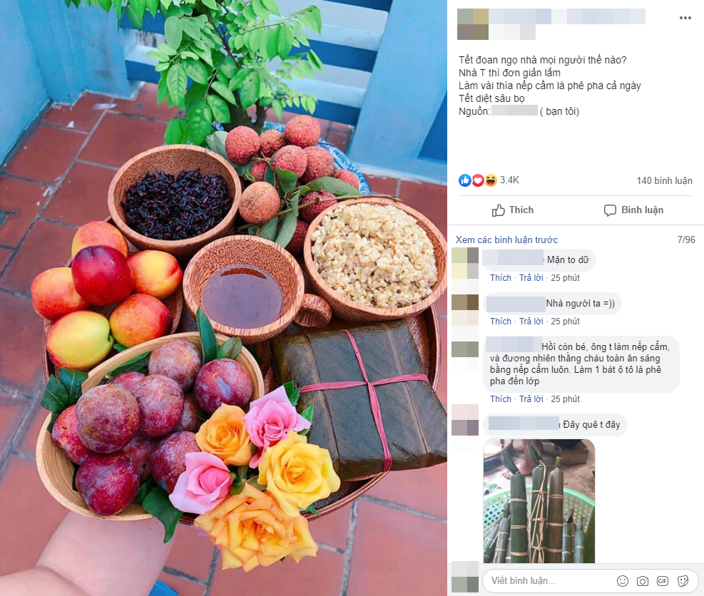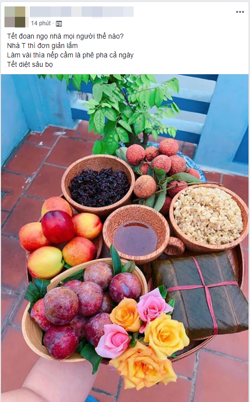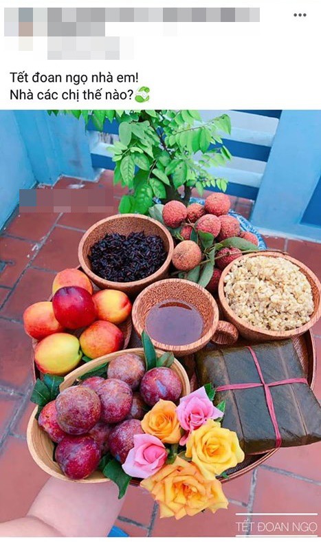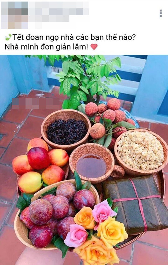 Chẳng là anh chàng có tên N.B đã đăng tải ảnh một mâm cỗ Tết Đoan Ngọ lên 1 nhóm kín trên MXH và viết: "Tết Đoan Ngọ nhà mọi người thế nào? Nhà mình thì đơn giản lắm, làm vài thìa nếp cẩm là phê pha cả ngày Tết diệt sâu bọ".