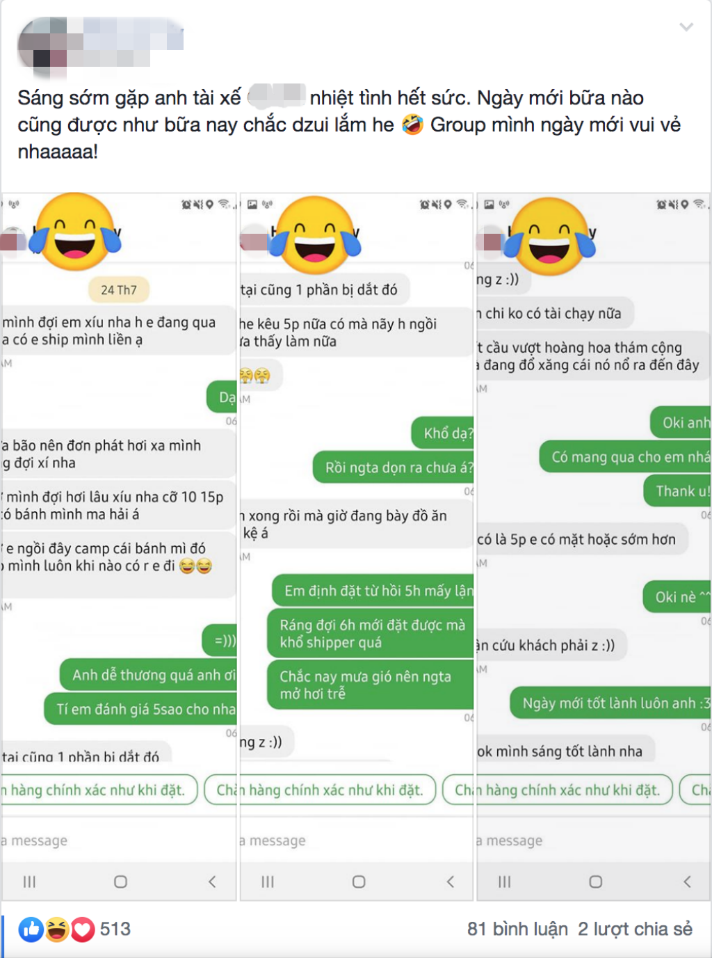 Ngoài ra dân mạng cũng không quên chia sẻ về những anh shipper dễ thương mà mình được gặp. Hiện tại câu chuyện vẫn đang thu hút sự chú ý cực lớn của cộng đồng mạng, nhất là hội chị em.