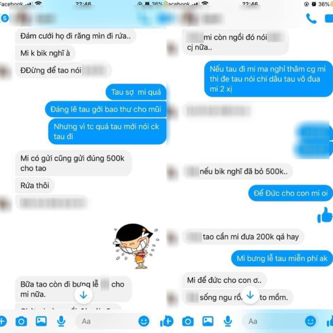 Mình sốc quá, không nói nên lời. Sau đó mình có nhắn lại là: "Sao mày sống mà tính toán hơn thua nhau từng đồng một? Tao bận không đi được, chỉ có một mình chồng tao đi, thì bạn đang khó khăn mừng 300 nghìn cũng được, sao lại chửi tao?"