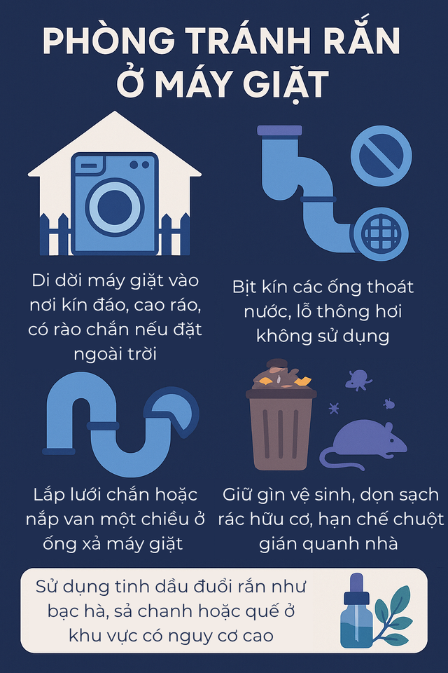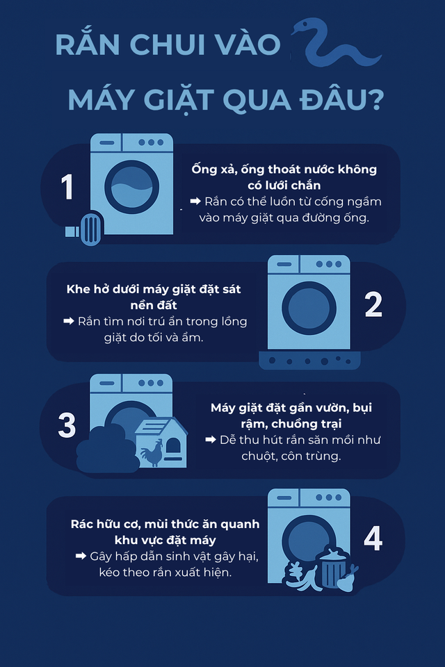 Cấu tạo của máy giặt gồm lồng giặt rỗng, nhiều khe hở thông với ống cấp – xả nước, đặt sát nền nhà. Nếu ống dẫn không được che chắn kỹ, rắn có thể theo đường ống chui vào bên trong. Một số loài như rắn ráo, rắn nước thường săn chuột hoặc côn trùng nên càng dễ bị thu hút vào khu vực có mùi thức ăn, rác hữu cơ hoặc nơi ẩm thấp như gần máy giặt ngoài trời.