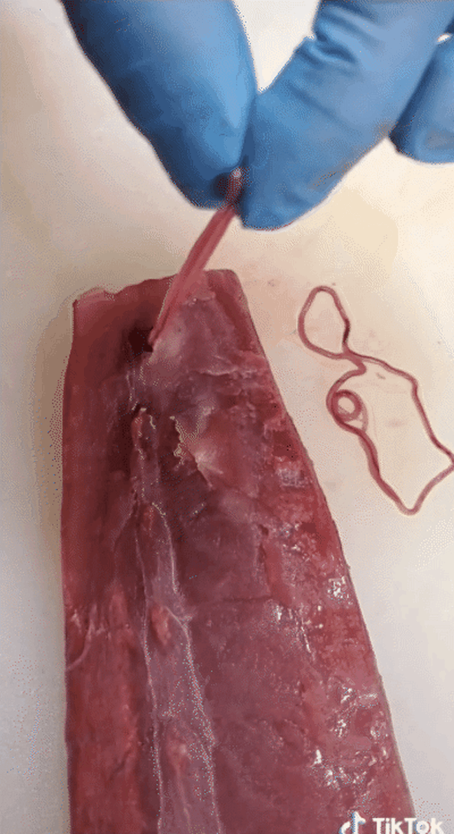 Chẳng biết bằng cách nào mà vị đầu bếp này có thể xác định được vị trí của từng con giun sán rồi dùng dao lôi nó ra. Con nào con nấy cũng dài hàng chục centimet khiến dân mạng vừa xem vừa rợn da gà.