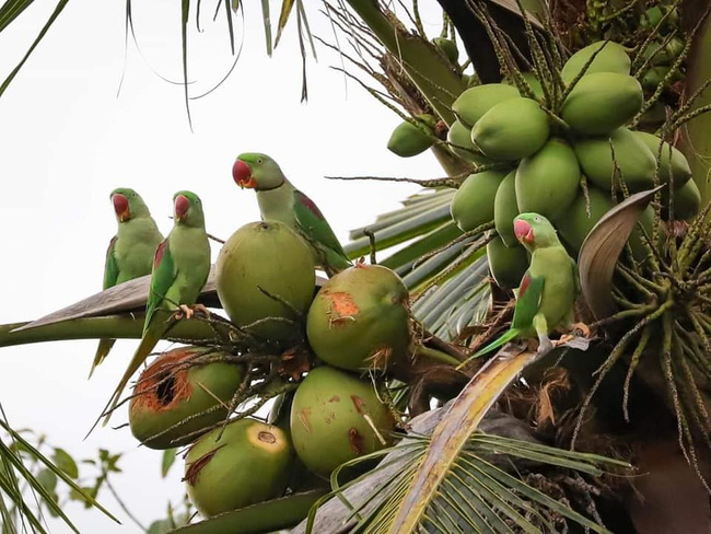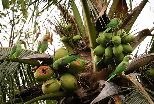 Mới đây, trên mạng xã hội có chia sẻ một bài viết có hình ảnh vô cùng lạ mắt và thú vị, đó là những chú vẹt màu xanh đậu trên cây dừa siêu nhiều quả. Điểm đáng chú ý nhất của bài viết ngoài việc khoe chiếc cây sai trái thì còn tập trung vào sự đáng yêu của đám vẹt, rằng không hiểu sao chúng lại biết những quả dừa đó cùng màu với lông của mình mà đậu vào nhỉ?