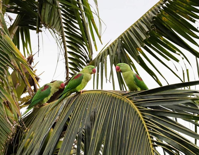 Đã có một sự trùng hợp thú vị ở đây, những chú vẹt màu xanh đã chọn đậu trên một cây dừa mà lá cũng xanh, quả cũng xanh. Cư dân mạng thực sự đã đặt câu hỏi về mức độ nhận diện màu sắc của các em này.