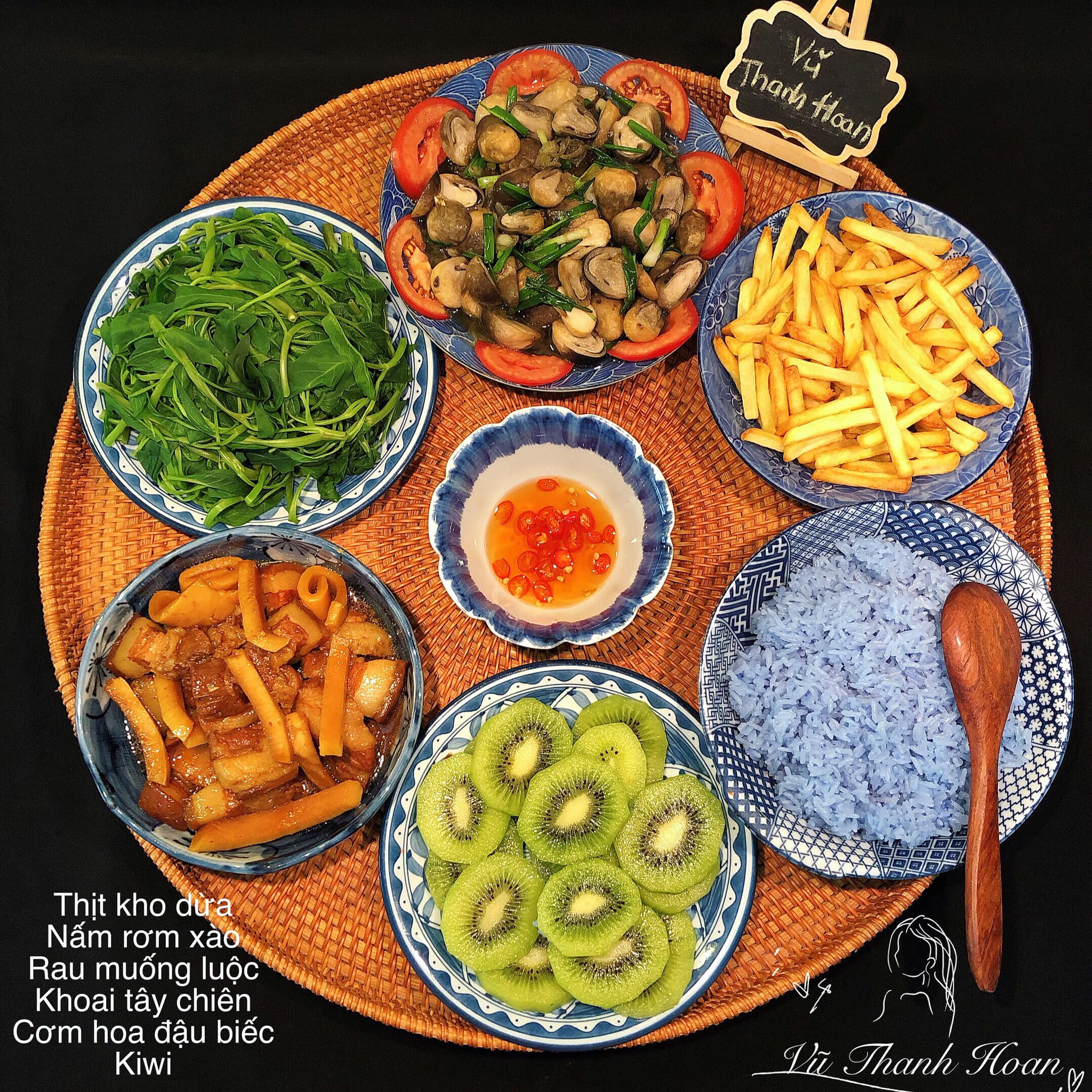 Một bí quyết nữa để mâm cơm của chị trở nên hấp dấn và ngon mắt đó là chị Hoan thường xuyên "nhuộm" màu cơm. Để tạo màu xanh, chị dùng hoa đậu biếc. Màu tím là màu của cây tím cẩm do chính chị trồng. Biến đổi màu cơm như vậy sẽ "hô biến" những bữa ăn trở nên đẹp mắt, lạ miệng.