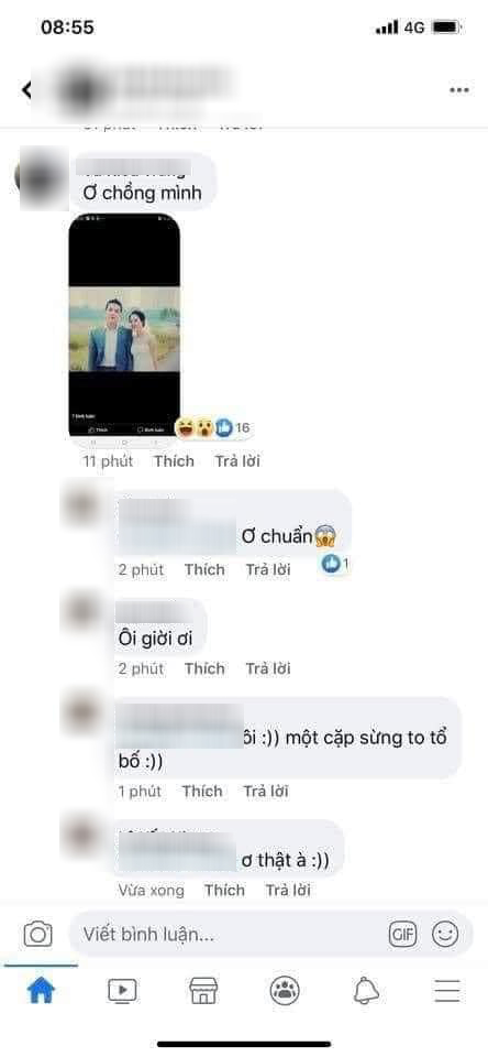 Cụ thể, hình ảnh này sau khi được chia sẻ lên fanpage đông đảo thành viên, một tài khoản có tên V.K.T đã nhanh tay bình luận: "Ơ, chồng mình". Để tăng thêm sự tin tưởng, chị T. còn đính kèm ảnh cưới của 2 vợ chồng.