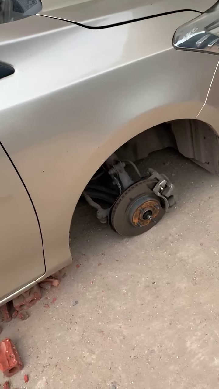 Khổ chủ bất lực nhìn chiếc xe 4 bánh nhưng giờ chẳng còn chiếc bánh nào nằm trơ vơ giữa bãi đỗ xe chắc hẳn sẽ phải xót xa lắm.