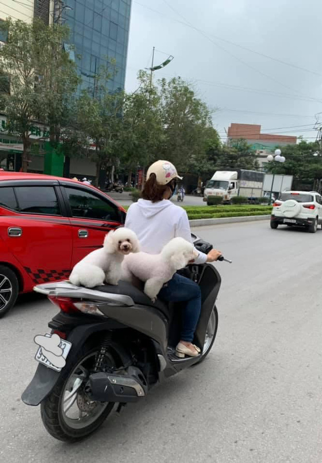 Hình ảnh xuất hiện trong một nhóm chia sẻ kinh nghiệm nuôi thú cưng. Theo đó, cô gái chở 2 chú cún phía sau xe máy nhưng không có biện pháp bảo vệ nào. Hai con vật ngơ ngác đứng, ngồi khá chông chênh, tiềm ẩn nhiều nguy cơ mất an toàn.