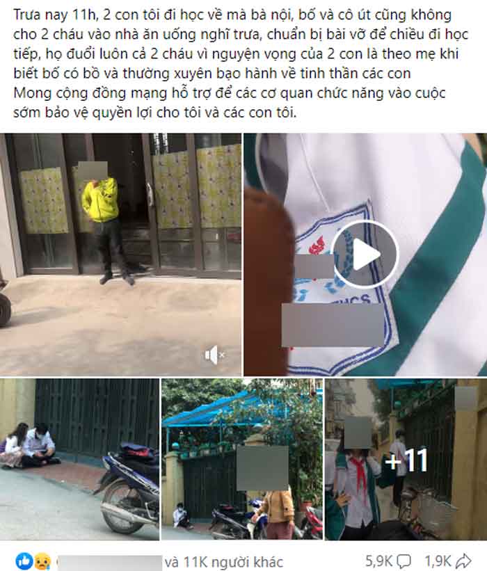 Đến trưa 2 con đi học về nhà bà nội, bà và em chồng cũng không cho 2 cháu vào nhà ăn uống nghỉ chưa chuẩn bị bài vở để chiều đi học tiếp. Họ đuổi luôn cả 2 cháu chỉ vì nguyện vọng của 2 cháu là muốn được sống với mẹ.