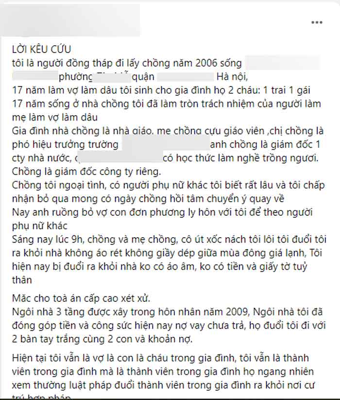 "Thân gái một mình, từ Đồng Tháp tôi ra Hà Nội làm dâu đến nay là 17 năm có lẻ, có với nhau 2 con 1 trai 1 gái tưởng đâu cuộc sống đến nay sẽ yên ổn đầm ấm thì cuối cùng giờ này 3 mẹ con rơi vào cảnh màn trời chiếu đất, chẳng nơi dung thân phải tá túc tại đồn công an phường Tây Mỗ.