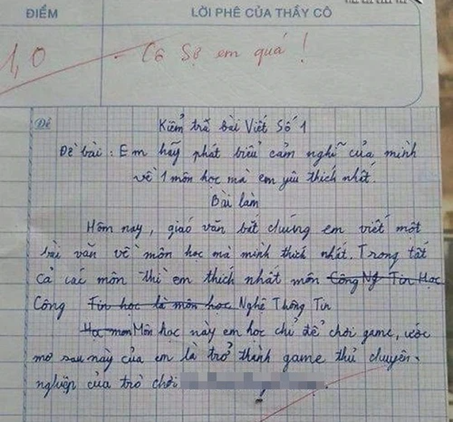 Có vẻ cậu bé đã rất đắn đo, suy nghĩ trằn trọc khi viết về môn học yêu thích của mình. Bằng chứng là cậu nhóc gạch xóa bài viết chằng chịt. Trước đam mê của cậu học trò nghiện game, giáo viên đã chấm bài văn 1 điểm cùng lời phê "Cô sợ em quá".